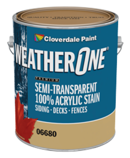 WeatherOne® Exterior 100% Acrylic Semi-Transparent Stain is a premium quality, pure acrylic stain that provides a long lasting decorative finish by allowing the natural wood grain to show through. This product is a fast drying, low sheen, abrasion resistant product that provides excellent penetration into the wood surface. This is a water-based, low VOC product which develops a high degree of water resistance when dry. 06680 is a clear tint base and must be tinted with universal colourant.